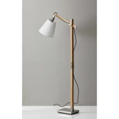 Introduce this Walden floor lamp into rustic, contemporary or eclectic settings. Wooden joints adjust the balance arm to change the height and angle of the shade. The black fabric cord threads through the square wood post body and drapes out the back. The satin steel base and accents enhance an industrial style, while a clean off-white fabric shade softens the look. A three-way rotary switch is located on the socket. The 3-way rotary socket switch will only work with a 3-way light bulb, otherwise this lamp will function with simple on/off switch at its highest setting. This lamp is smart outlet compatible. Bulb is not included.