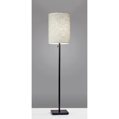 The Liam Floor Lamp is an elegant style that highlights simple materials and a classic silhouette. A thick dark bronze finished metal pole supports a natural textured fabric shade. A tall cylinder shade is contrasted by a compact square shaped metal base. A simple pull chain turns the lamp on and off. Place this floor lamp in your living room for a soft, transitional look. This lamp measures 60.5″ tall and looks great along with a variety of modern décor styles.