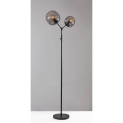 Set the mood with the Ashton Floor Lamp. Included with this purchase, are two vintage style edison bulbs with a unique globe shape that mirrors the shape of a beautiful smoked glass shades. A matte black metal finish and a black fabric covered cord adds contemporary edge. The double shade construction transforms this strikingly decorative piece into a functional floor lamp lighting up a large area. Turn the lamp on and off with a simple rotary switch.