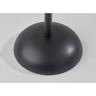 - A matte black finish is paired with a soft, taupe textured fabric shade.