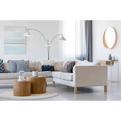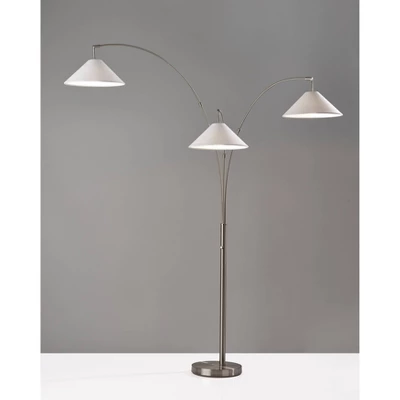 Add a modern touch to your space with the clean styling of the Braxton 3-Arm Arc floor lamp. The arcing design and slender profile of this 86″ tall lamp makes it the perfect light source for any space. The 12.5″ diameter round brushed steel base provides stability, while the clean lines in brushed steel add a modern, minimalist touch. The brushed steel finish continues through the pole and arcing arms. For maximum versatility, the lamp features three arms, each topped with a 60W bulb (not included) and textured white fabric shade that features a contemporary cone shape. The three arms can be swiveled and repositioned from the base and each head features an adjustable joint, allowing you to direct the light wherever it’s needed. Operated by a rotary switch located on the stem, this lamp features multiple lighting settings. A simple twist of the switch turns one lightbulb on, another twist turns two of the lightbulbs on, a third twist illuminates all three of the lights, and a fourth twist turns all lights off. The Braxton 3-Arm Arc floor lamp is also available with a dark bronze finish and coordinating light brown textured fabric shade.