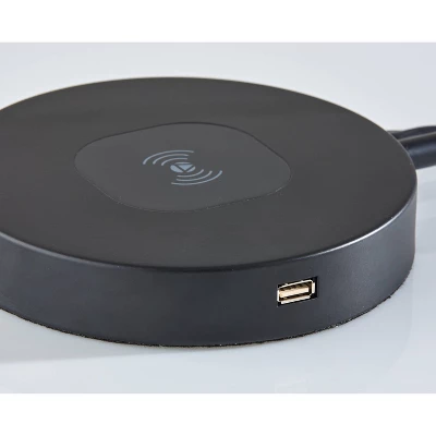 Boasting a sleek, contemporary design, the Emerson AdessoCharge desk lamp brings stylish functionality to your room. Crafted of monochrome black painted metal, the lamp design is dominated by a large globe shade measuring 6.5″ in diameter. Painted white on the inside, the shade projects bright, crisp light from a 60W bulb and features an articulation point, allowing you to rotate the shade up or down and side to side to direct the light wherever it’s needed. A rotary switch located on the back of the shade allows you to easily turn the lamp on or off. A thin stem leads to a round 6.5″ diameter base with a wireless chargin pade built flush into it. Featuring Qi inductive charging technology, you can conveniently charge compatible devices by simply placing your device on the pad for clean, cord-free charging. The AdessoCharge pad supports 5W charging on contact with the charging pad, which gets your phone from a battery charge of 0% to 100% in just 4-5 hours, depending on your phone model. For added functionality, a USB outlet is discretely built into the side of the base for charging an additional device. The wireless pad, USB outlet, and light can all be used simultaneously. Complete your space’s décor with the coordinating Emerson floor lamp.