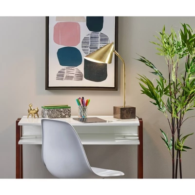Bring mid-century modern style to your space with the 20″ tall Hawthorne desk lamp. Featuring a chunky cube-shaped base made of brown marble anchoring an antique brass pedestal and shade, this lamp is both sleek and refined. It offers an articulation point at the joint of the curved cone-shaped shade, allowing you to direct the light wherever it’s needed. Operated by a rotary switch on the shade to easily turn the 40W bulb (not included) on or off, this lamp also features a 5′ clear cord. Complete your space’s look with the coordinating Hawthorne floor lamp and Hawthorne tree lamp.